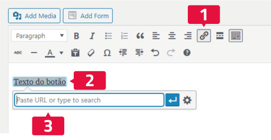 Para inserir um link com aparência de botão basta usar o shortcode “bt”, note que ele precisa receber o argumento ‘link=”url_aqui”‘, para incluir o link de acesso no botão. Veja a imagem abaixo: